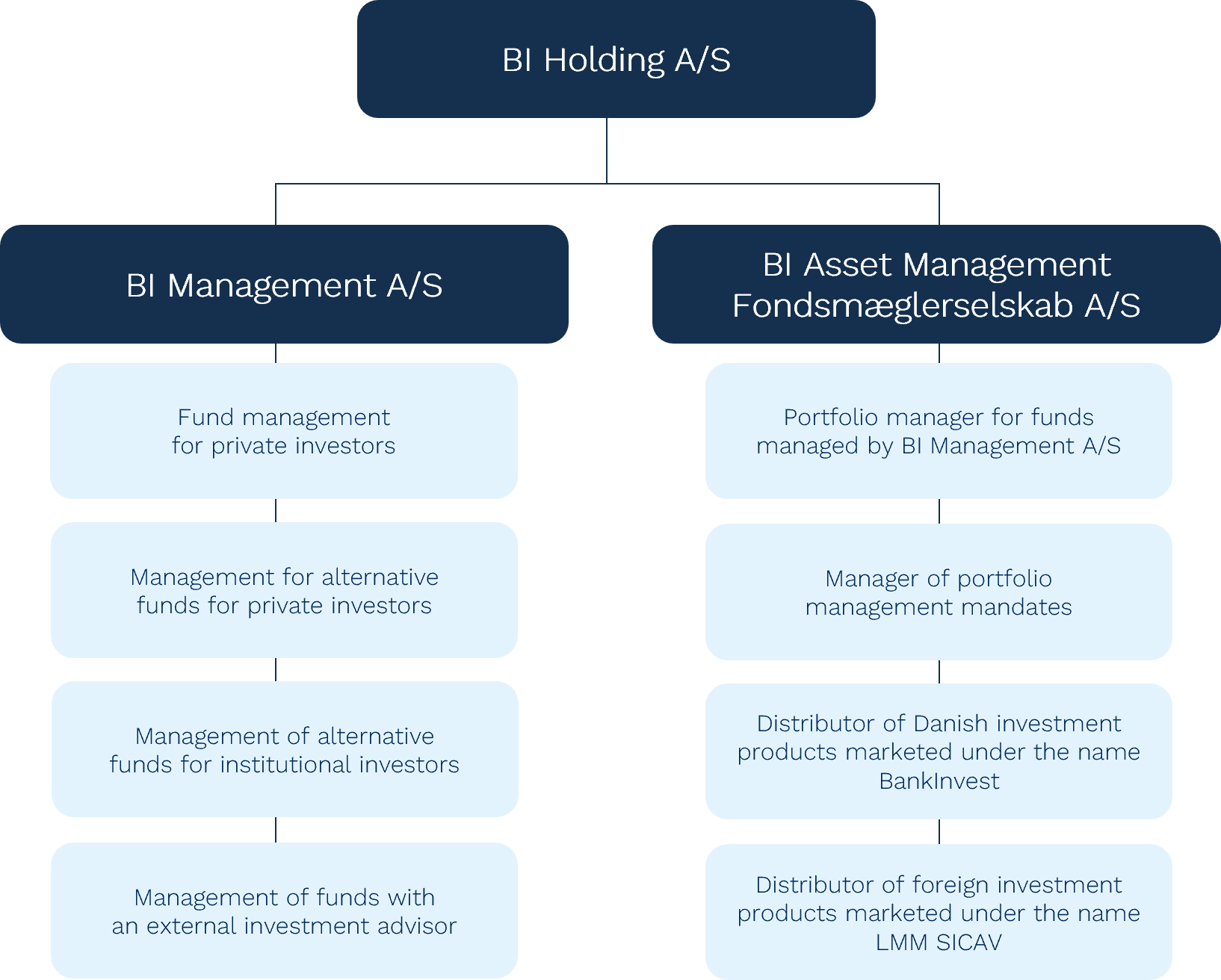 The BankInvest group consists of the parent BI Holding A/S and the two most important subsidiaries BI Asset Management Fondsmæglerselskab A/S and BI Management A/S. The group also includes a number of small companies.